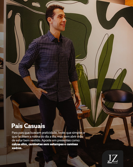 Para pais que buscam praticidade, looks que simples e que facilitem a rotina do dia a dia, mas sem abrir mão de estar bem vestido. Aposte em presentes como: calças slim, camisetas sem estampas e camisas xadrez.